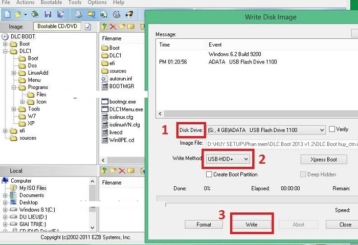 Bước 3 : Ở bước này bạn để file iso ghi ra USB bằng các nhấn vào Bootable và chọn Write disk image. Trong phần này các bạn nhìn thấy dòng Disk Drive sẽ có các lựa chọn cách tạo USB và ngoài ra ở phần Write Method các bạn nhấn vào USB-HDD+ như hình ảnh minh họa bên dưới