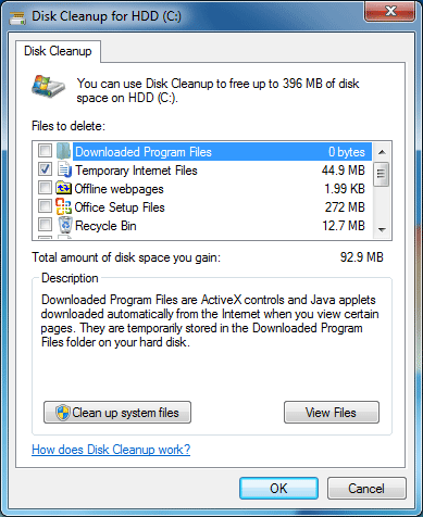 Bước 2 : Tại đây các bạn chọn Temporary Internet Files và click Clean up files files như hình minh họa bên dưới