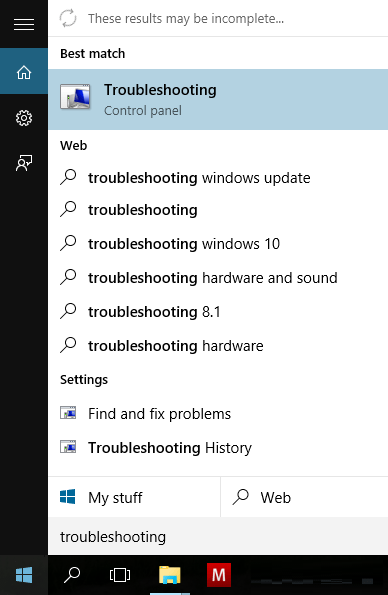 Bước 1 : Đầu tiên các bạn thực hiện vào start trên win và trong ô tìm kiếm gõ Troubleshooter như hình minh họa bên dưới.