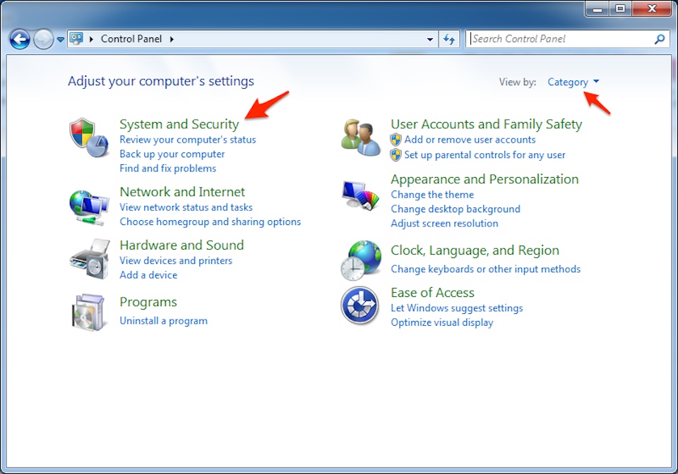 Bước 3: Một ô cửa sổ mới có tên Control Panel hiện ra, tìm chọn Category và ấn chọn mục System and Security.