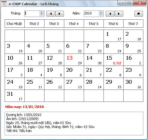 Mặc dù phần mềm này của tác giả Nguyễn Trung Tín đã ra mắt được cách đây gần 8 năm nhưng mức độ ứng dụng cũng như độ thuận tiện của nó không làm người dùng thất vọng. nó giúp bạn tra cứu các ngày tháng hiện tại, tương lai, quá khứ; bạn có thể điều khiển nó bằng các phím trên bàn phím máy tính như để xem tuần sau bạn chỉ cần nhấn tổ hợp phím Ctrl và phím mũi tên bên phải, hay tháng sau thì thay Ctrl bằng Shift và thay bằng Spacebar để xem năm sau.