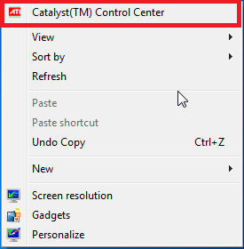 - Bước 1: Để mở trình điều khiển ATI thì click chuột phải lên khoảng trống màn hình PC rồi chọn Catalyst (TM) Control Center ngay trên đầu tiên. Sẽ xuất hiện cửa sổ ba thanh trượt điều khiển.