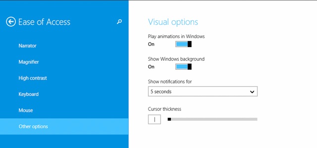 Với Windows 8 và 8.1 thì nhấp tổ hợp phím “Windows + S“. Khi mở được bảng search ra thì gõ “Animations” rồi chọn “Turn Windows Animations On or Off” để tắt hiệu ứng không cần thiết nhé.