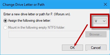 Bây giờ, hệ thống của windows sẽ hiển thị ra trong phần assign the following drive letter : những ký tự từ A -> Z cho bạn lựa chọn ( lưu ý không đổi được tên ổ đĩa đã có sẵn trong máy tính ) và nhấn OK để hoàn thành