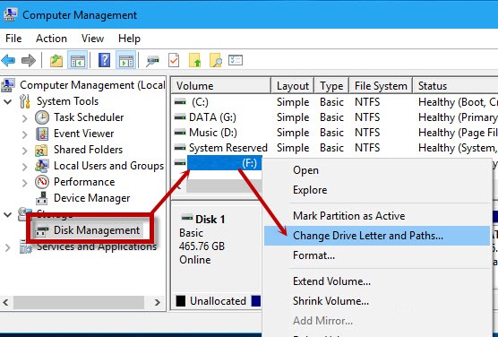 Tiếp theo ở cột phía bên tay trái các bạn tích vào Disk Managerment. Tiếp đến bạn sẽ nhìn thấy các ổ đĩa hiện lên ở mục bên tay phải và để thay đổi ký tự ổ đĩa cho win các bạn nhấn chuột phải chọn Change Drive Letter and paths.. ( lưu ý rằng riêng ổ hệ thống C: thì bạn không thể thay đổi nhé )