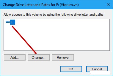 Ở đây mình thay đổi ổ F: và chọn tiếp vào Change… như hình ảnh minh họa bên dưới