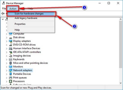 Bước 4 : Ở bước này bạn ấn vô menu chọn Action và nhấn chọn tiếp vào Scan for hardware changes như hình minh họa bên dưới