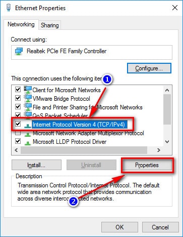 Bước 3 : Tiếp theo ở cửa sổ hiển thị lên bạn tích một lần vào Internet Protocol Version 4 (TCP/IPv4) và nhấn tiếp Properties như hình ảnh minh họa bên dưới