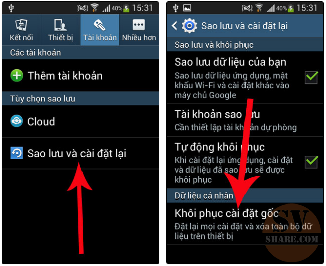 Để sao lưu và khôi phục bạn thực hiện vào cài đặt của điện thoại chọn Tài khoản và click vào Sao lưu và cài đặt lại , cuối cùng là nhấn vào sao lưu và cài đặt lại