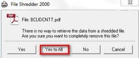 Bây giờ bạn sẽ được hiển thị thông báo hỏi rằng có chắc chắn muốn xóa file, dữ liệu đó hay không ? Việc chấp nhận này sẽ khiến cho file đó không thể nào khôi phục lại được trên máy tính nữa. Để đồng ý các bạn nhấn Yes to all