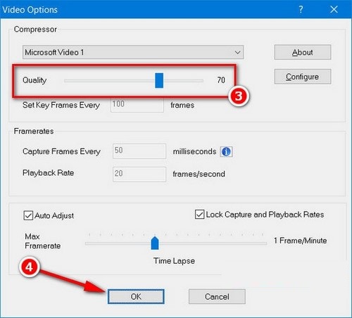 Lưu ý : Như bình thường thì phần mềm Camstudio này sẽ để mặc định là 70 ( trung bình ) nếu như bạn muốn để chất lượng tốt nhất nhằm có một video rõ nét HD thì có thể kéo lên 100 nhé.