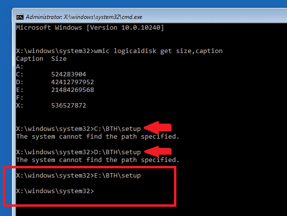 Lúc này người dùng sẽ gõ theo cấu trúc tên ổ cứng BTHsetup, chạy từ C, D, E, F, G, K,… cho đến khi dòng The system cannot find the path specified không còn hiện lên thì cửa sổ Windows Setup xuất hiện.