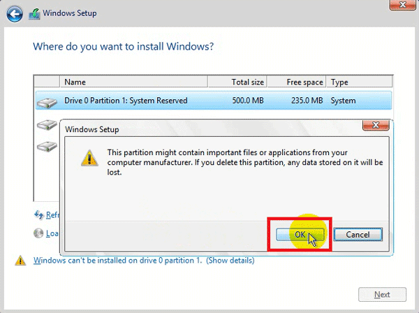 Chọn Apply để tạo mới phân vùng hệ thống. Rồi chọn OK.