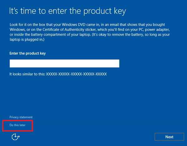 Click vào Do this later, Windows sẽ tự nhận bản quyền key sau.