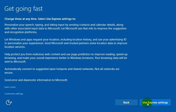 Chọn Use Express settings để thiết lập mặc định cho Win.