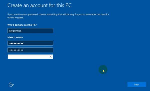 Lúc này cần nhập thông tin tài khoản dùng Win 10, điền vào ô đầu tiên và bỏ qua các ô sau cũng được, nhấn Next để tiếp tục chờ.