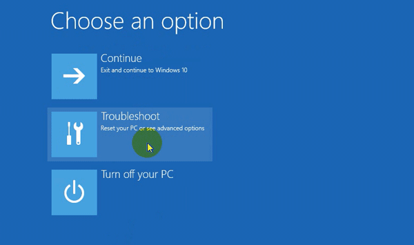 Máy tính được khởi động lại và boot vào chế độ Troubleshooting. Sau đó click vào Troubleshoot rồi chọn Advanced Options.