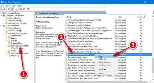 Bước 3: Tại Remove the networking icon nhấn đúp chuột để chọn Edit (Windows 10 Anniversary) hoặc Properties (Windows 10) để tùy chỉnh.