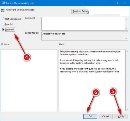 Bước 4: Vẫn tại giao diện Remove the networking icon thì chọn chuyển Enabled>Disabled rồi nhấn Apply và OK để tắt tính năng xóa biểu tượng Internet trên win 10.