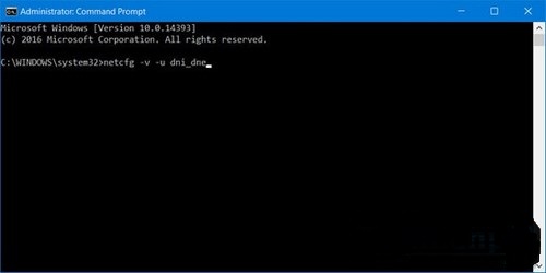 Bước 3: Tiếp tục nhập dòng lệnh: netcfg -v -u dni_dne như hình dưới đây: