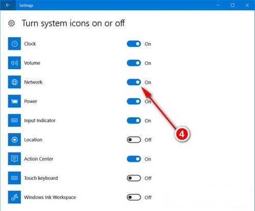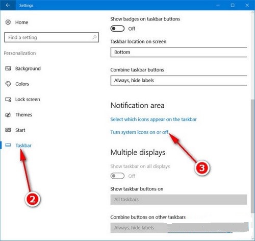 Chọn Taskbar > Turn system icons on or off để vào trang cài đặt các icon hệ thống trên win 10 sẽ được hiển thị tại thanh Taskbar.