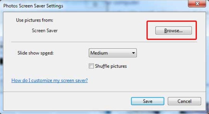 Bước 5 : Trong một pop-up hiện lên ở phần Use pictures from các bạn nhấn vào Browse rồi chọn hình ảnh đã tải trước đó lên để làm hình chờ và nhấn Save lại là xong