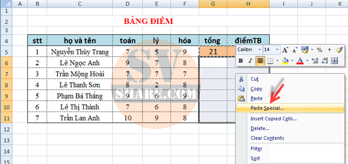 Bước 2: tiếp theo bôi đen vùng từ G6 đến H11,tiếp tục ấn chuột phải và chọn Paste Special…