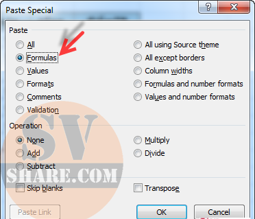 Sau khi cửa sổ Paste Special hiện ra, bạn hãy chọn Formulas như hình minh họa dưới đây