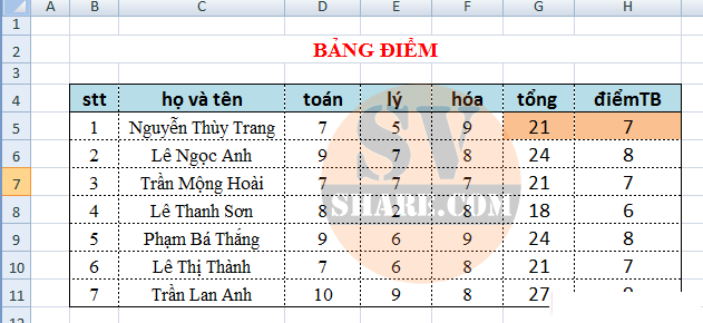 Mình đã nhập công thức ở 2 cột :Tổng và điểm TB và excel đã trả về kết quả như hình trên. Bây giờ mình sẽ sao chép theo 2 cách