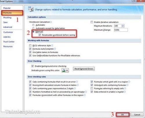 Bước 3: Tương tự trường hợp trên, chọn mục Formulas trên hộp thoại rồi sau đó chọn Manual và nhấp Ok